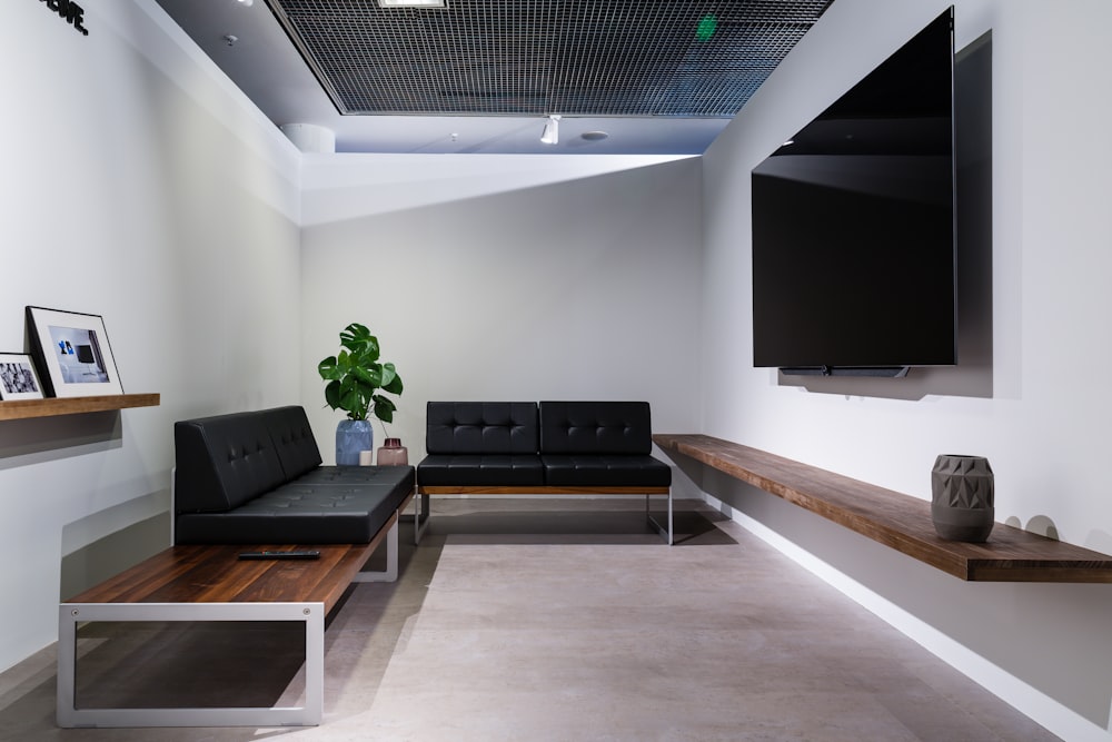 Brown Leather Couch In Front Of Brown Wooden Coffee Table Photo