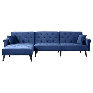 Mid Century Modern Style Fabric Sleeper Futon Sofa L Shape Navy