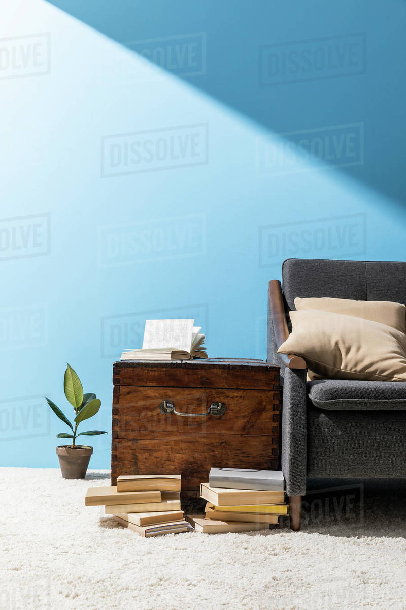 Old Wooden Chest With Cup Of Coffee And Books Near Couch In Front