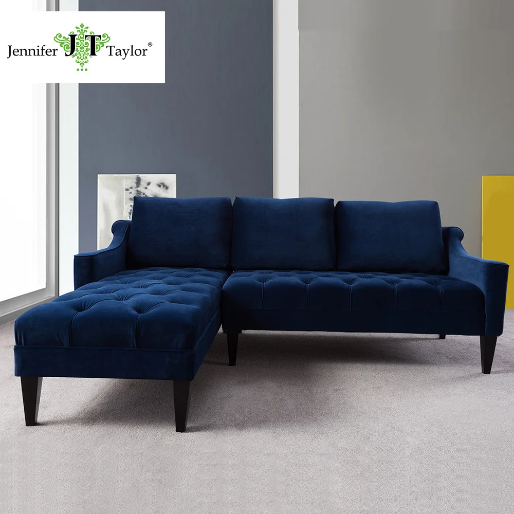 Custom One Piece L Shape Sofa Ottoman In Blue Velvet Upholstery