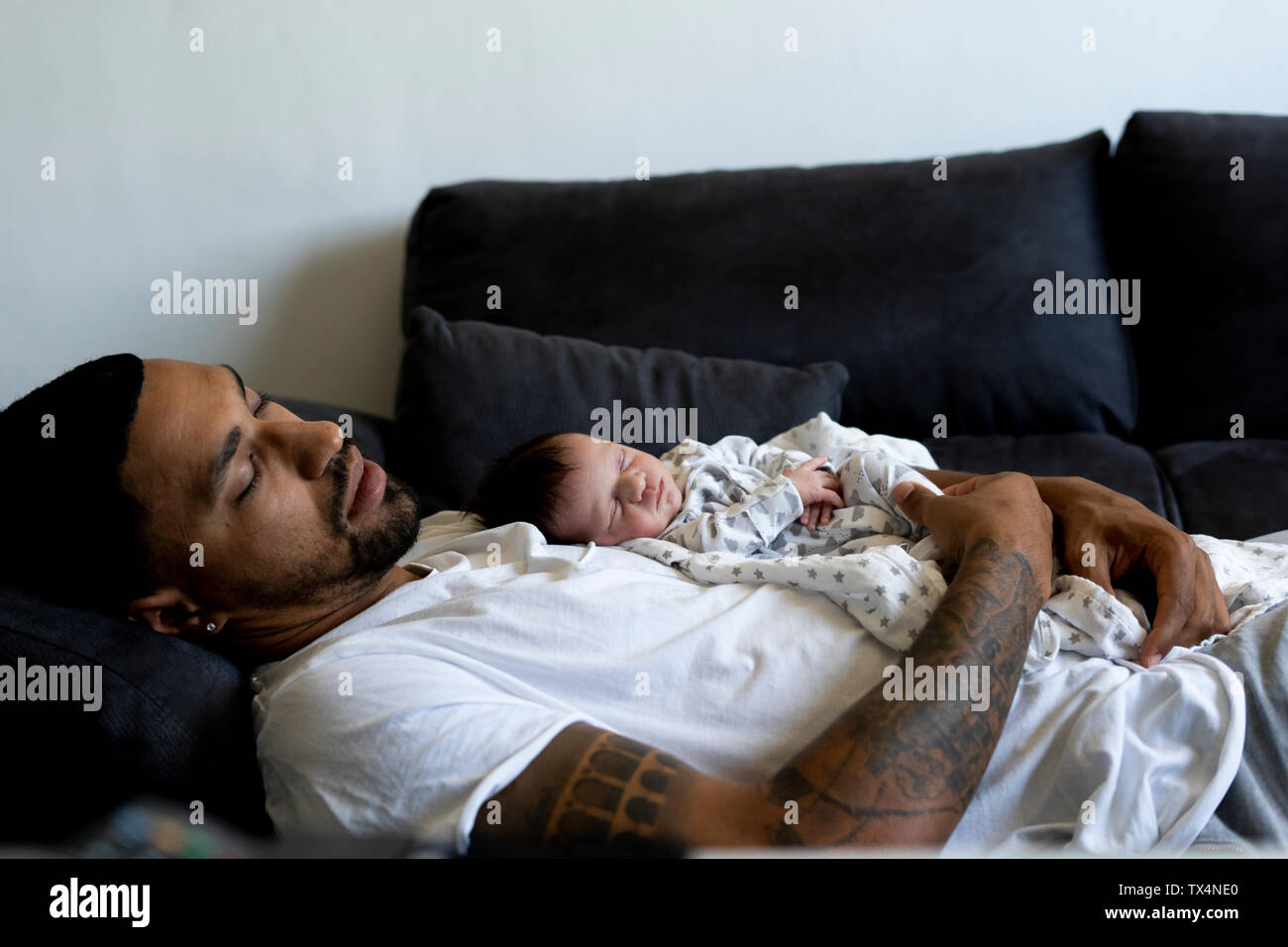 Father With Baby Sleeping On Sofa At Home Stock Photo