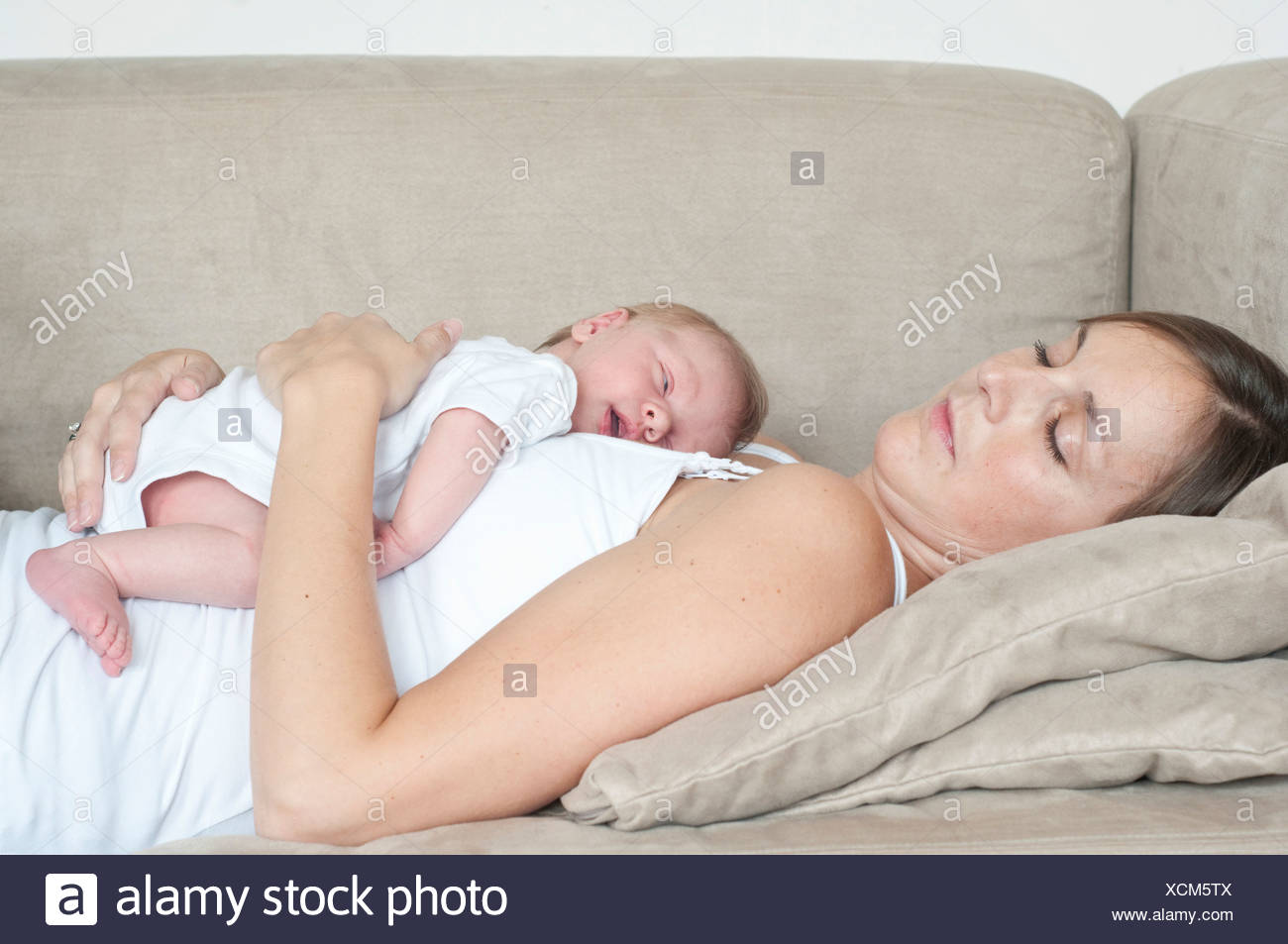 Side View Of Woman Sleeping With Baby Boy On Sofa At Home Stock